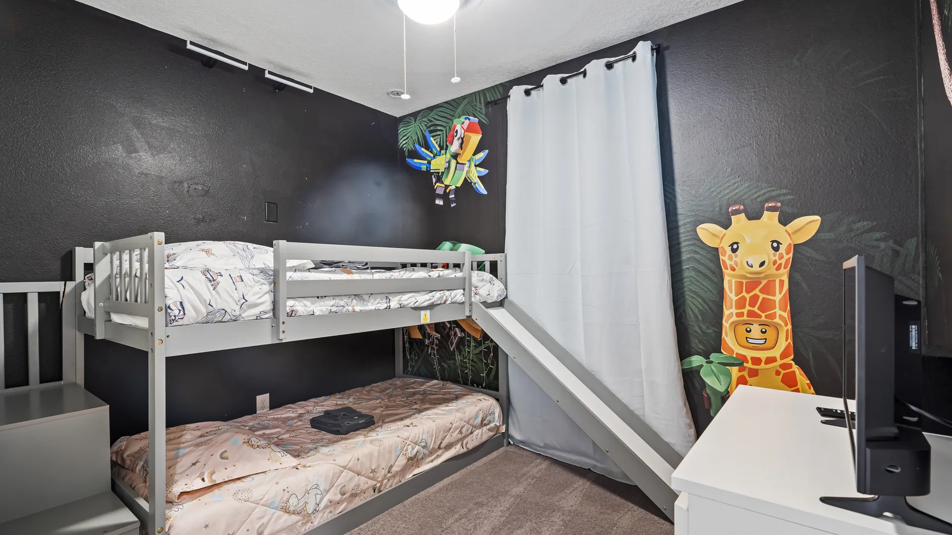 - Kid-Friendly Fun: Bunk bed with a slide and a Lego treasure hunt with surprises!